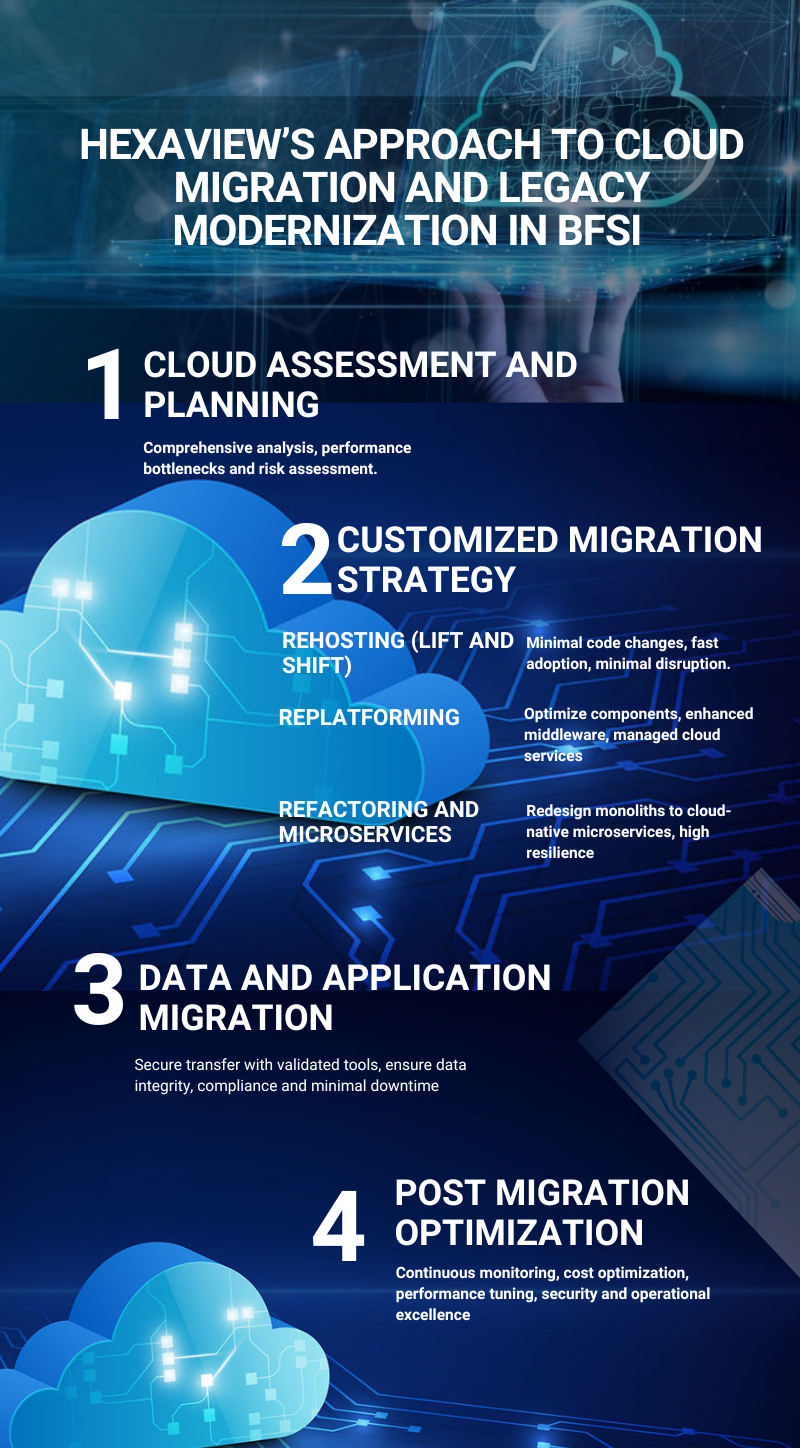Hexaview’s approach to cloud migration and legacy application modernization for BFSI mostly focuses on creating technology decisions based on business outcomes. Every application is individually assessed to understand the effective modernization strategy.