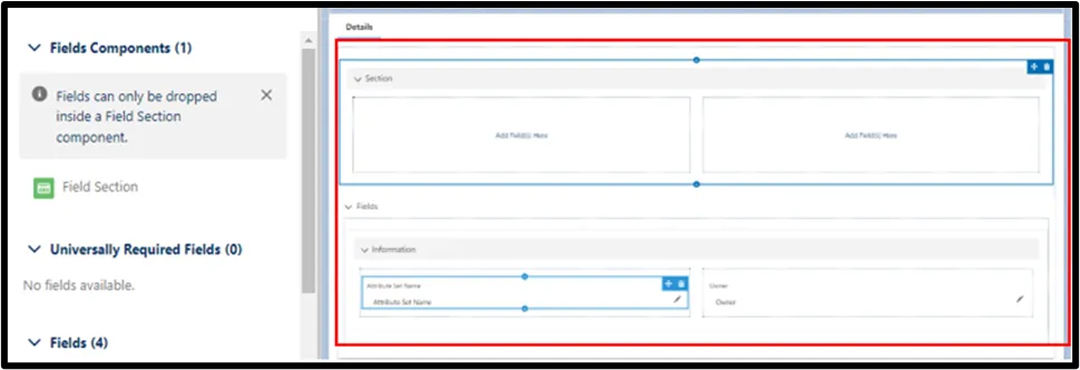 6. You will now see new functionality in Lightning App Builder. There are two new standard Lightning components called "Field Section" and "Field Components" under the Fields tab of the component palette. You can add a "Section" field to the page and select which fields go there.