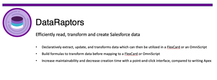 With a declarative mapping tool called a DataRaptor, you can read, edit, and modify data in Salesforce. Admins may save and show data with it without writing any Apex code. The primary method of manipulating data in OmniStudio is using DataRaptors.