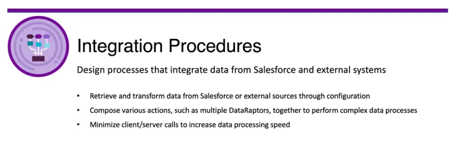 The processes needed to read and change data from external applications, such as Salesforce, are called integration procedures. Designers may create intricate data transformations using these server-side apps without having to write any code.