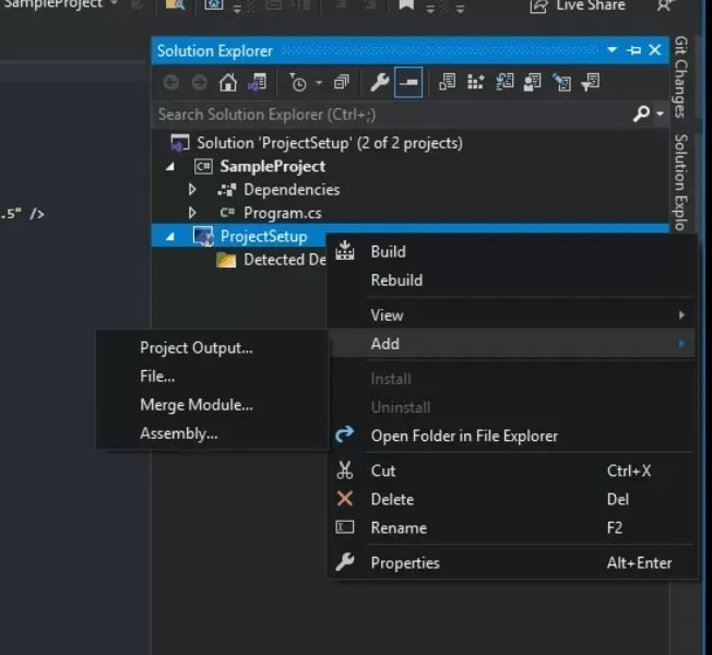 For adding files, Assembly, or merging modules, right-click on the project and then go to Add.