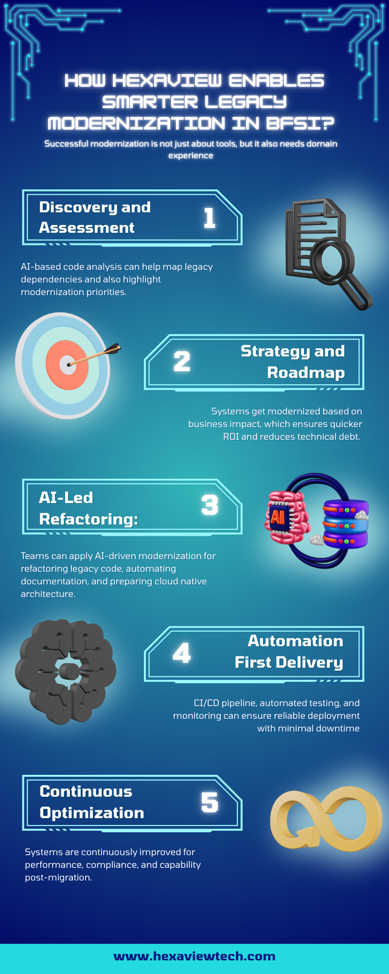 Successful modernization is not just about tools, but it also needs domain experience. Hexaview combines deep experience in banking, financial services and insurance with AI for a legacy modernization framework. It helps to deliver safe and faster outcomes.