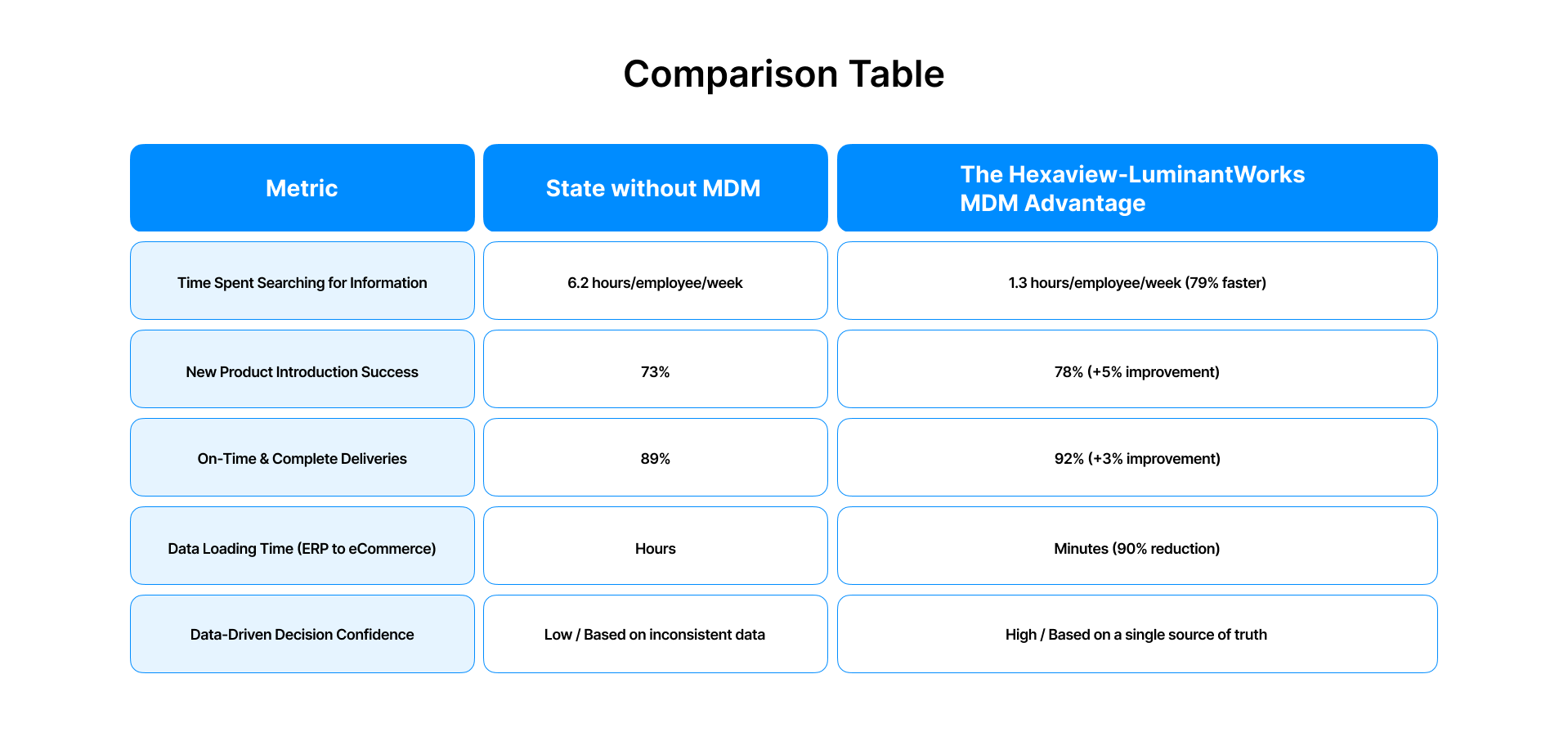 MDM streamlines critical end-to-end business processes like lead-to-cash, source-to-pay, and design-to-operate. The time employees spend searching for and validating information can be reduced by as much as 79%, freeing them to focus on higher-value activities. This translates into faster order fulfillment, more accurate billing, and optimized inventory management.
