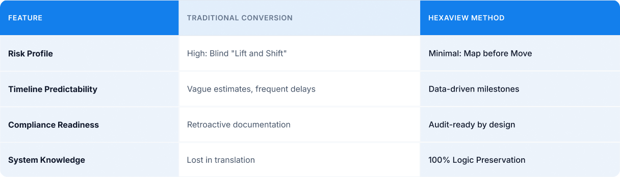 modernization failure rate, you cannot safely convert what you do not understand. We bridge the knowledge gap.